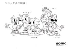 Concept fine art of Ray, Mighty, Sonic, Vector and a graphic symbol named Max (a redesigned version of Sharps), illustrated by Naoto Ōshima.